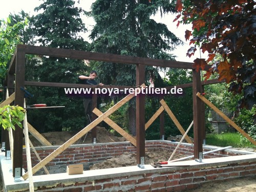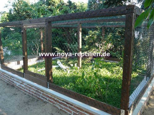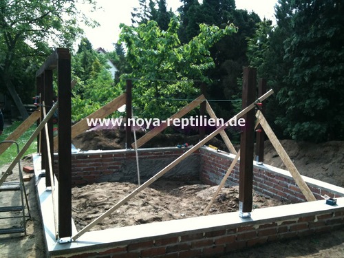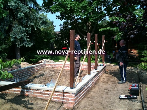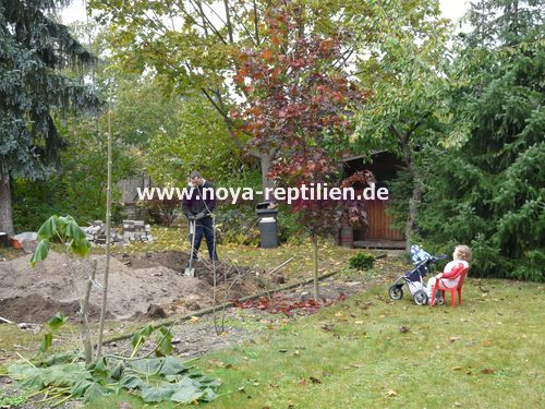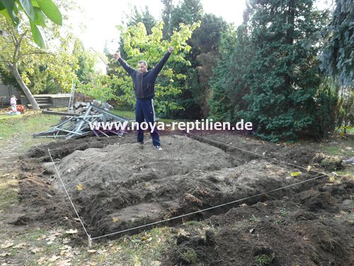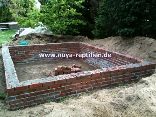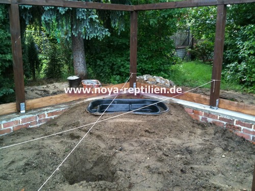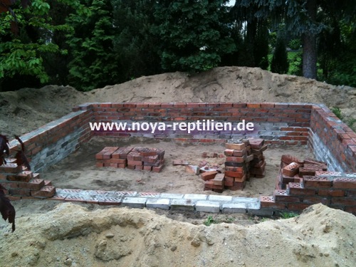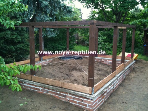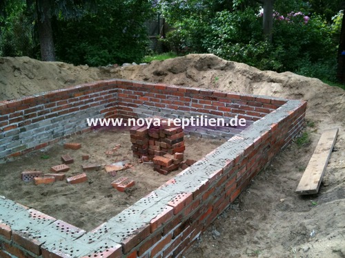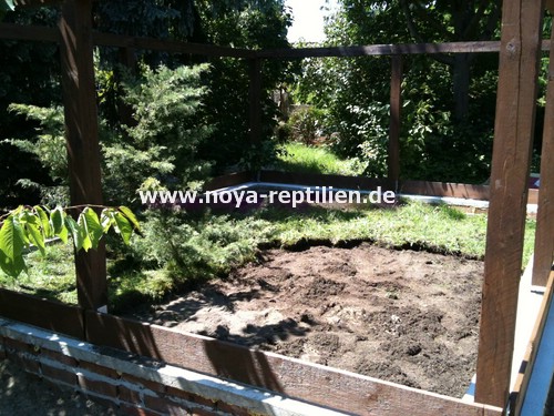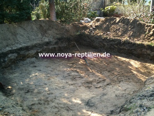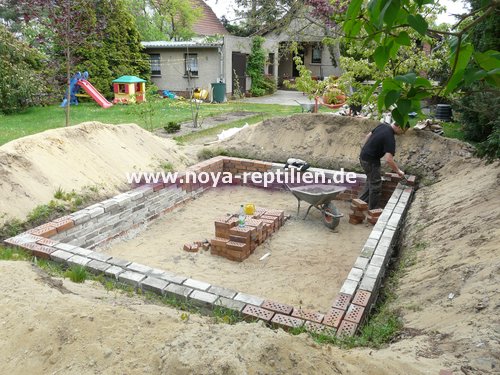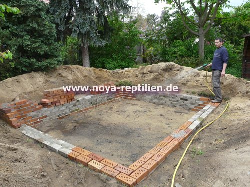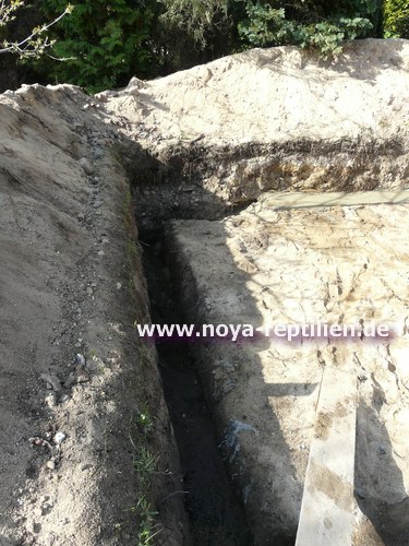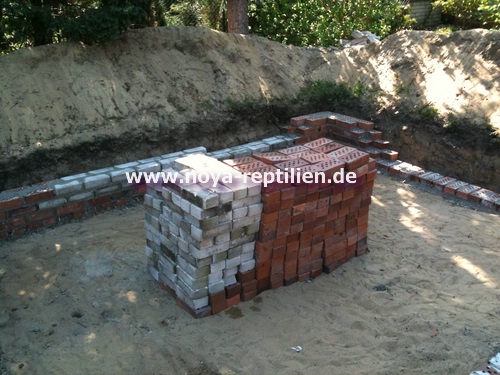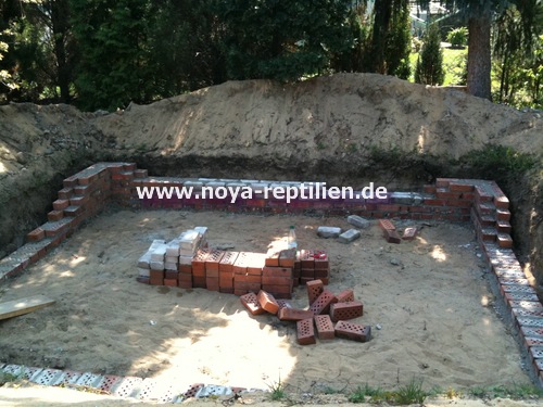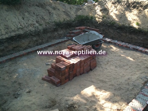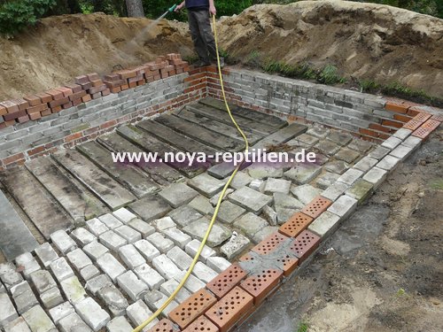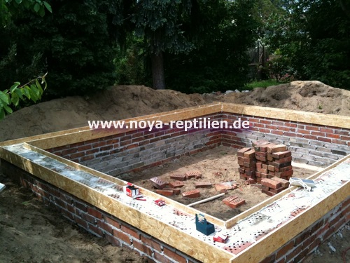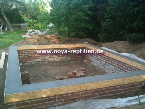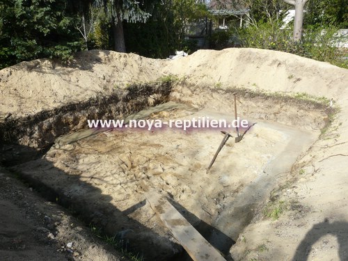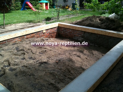 Da Tejus ja bekanntlich buddeln, müssen wir ihnen die Möglichkeit nehmen, sich aus der Anlage herauszugraben. Dazu werden wir in einer gewissen Tiefe eine Betonplatte einbringen und die Seiten mauern.
