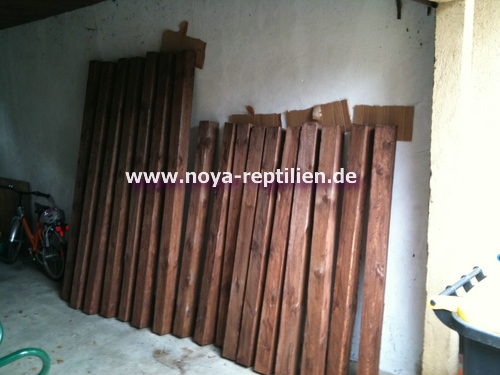 Dann haben wir uns ausreichend Holz für den Aufbau gekauft. Dieses muss als erstes mit Holzlasur gestrichen werden. Hier mal ein Teil des Holzes nach dem ersten Anstrich.