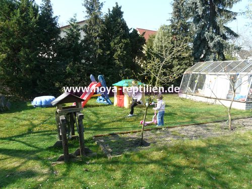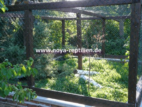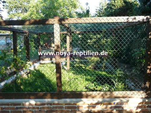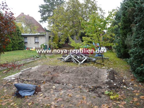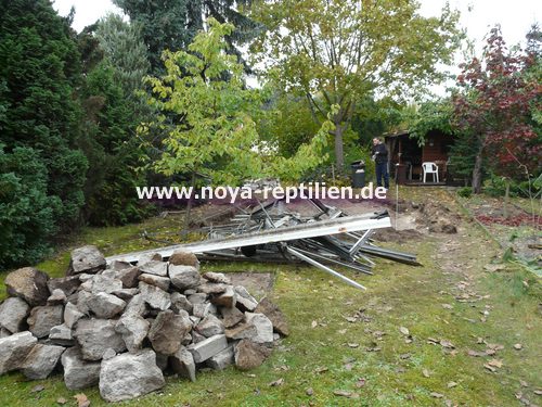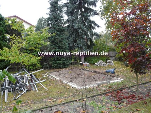 Als erstes mussten wir viel Überzeugungsarbeit bei der Eigentümerin des Gartens, in dem die Anlage stehen soll, leisten. Nachdem unsere Oma überzeugt war, mussten wir einen geeigneten Platz finden. Wir entschieden uns dann, das seit Jahren nicht genutzte Gewächshaus muss weg, da dieser Platz ideal für die Tejus wären.
