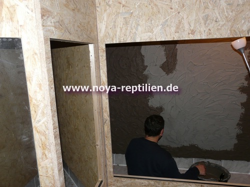 Nun mussten wieder viele Quadratmeter von Styropor an die Wände. Dieser wurde dann über mehrere Tage mit mehreren Schichten Fliesenkleber bestrichen. In die letzte geplante Schicht mischten wir Abtönfarbe. Dadurch sehen die Rückwände nicht so grau aus.