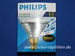 Ich benutze in allen Terrarien PAR38-Strahler meist von Philips. Diese gibt es auch von Osram, Sylvania usw. PAR38-Strahler sind in 60W, 80W und 120W erhältlich. Was man für sein Terrarium benötigt, ist abhängig von der Beckengröße. Im Endeffekt muss man es einfach ausprobieren. Diese Spots gibt es als "Flood" und "Spot"-Ausführung. Der Unterschied besteht einfach im Abstrahlwinkel. 12° vs. 30°.